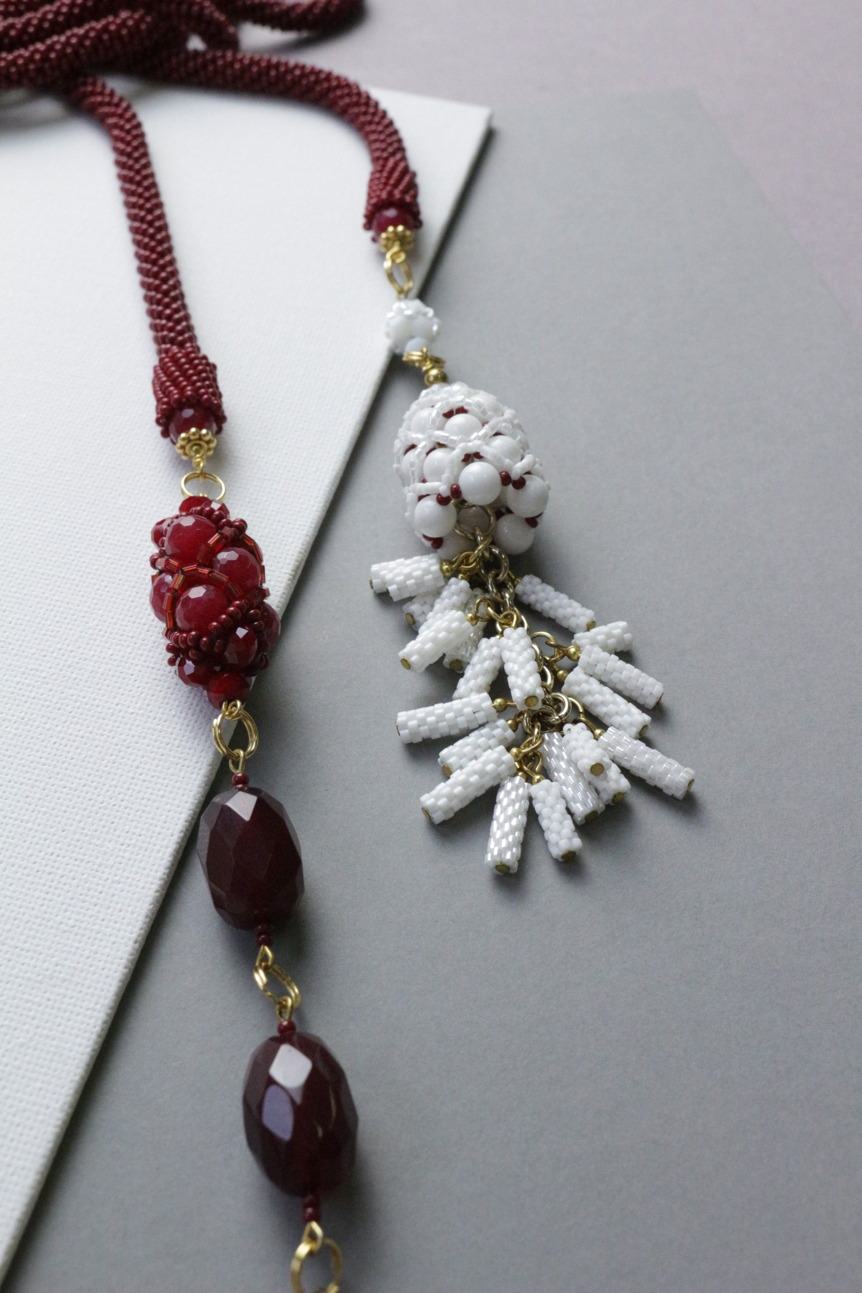 I really wanted to create something Latvian… And then i created this amazing dark red shade long necklace. The necklace is made of dark red seed beads and has two different beaded elements - white and red. The necklace is designed in a versatile way and can be worn in different styles allowing it to be adapted to different outfits. Every detail has been carefully crafted to showcase sophisticated elegance.
