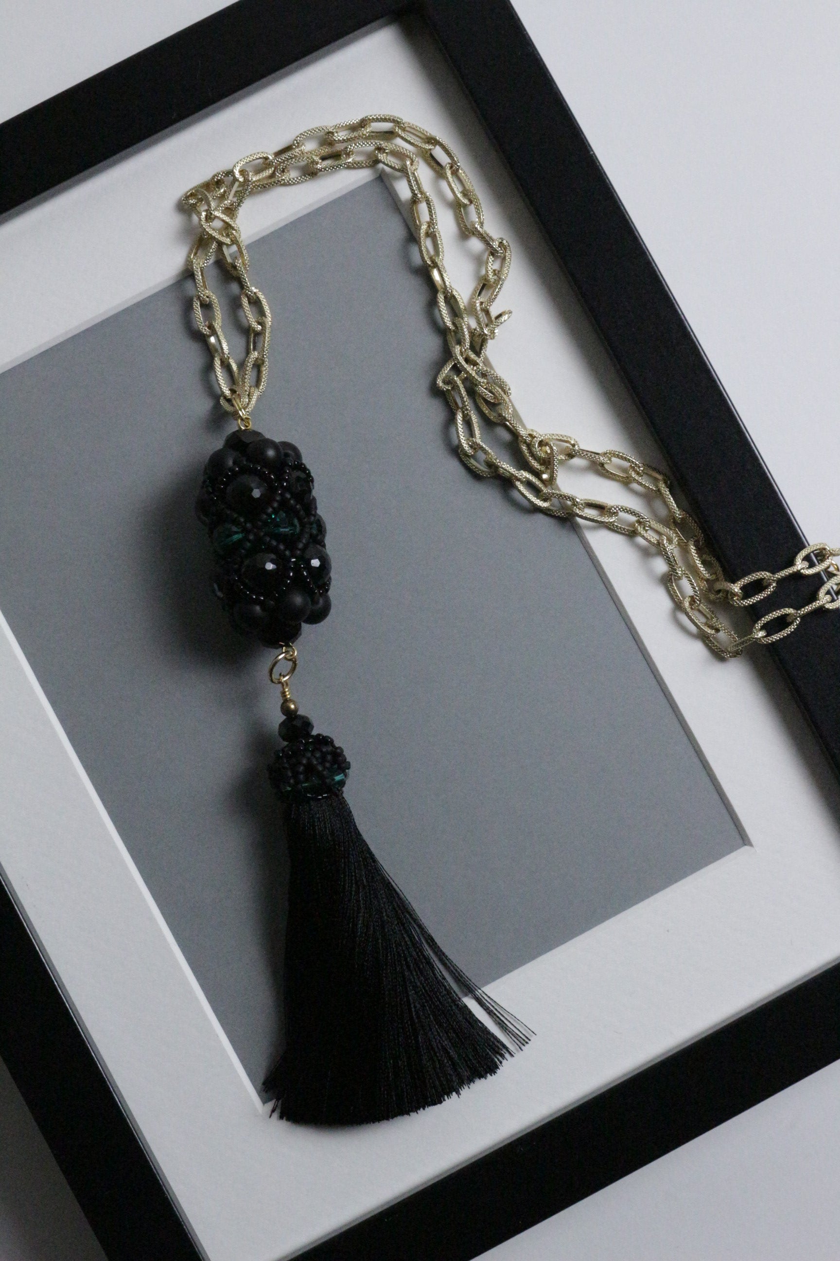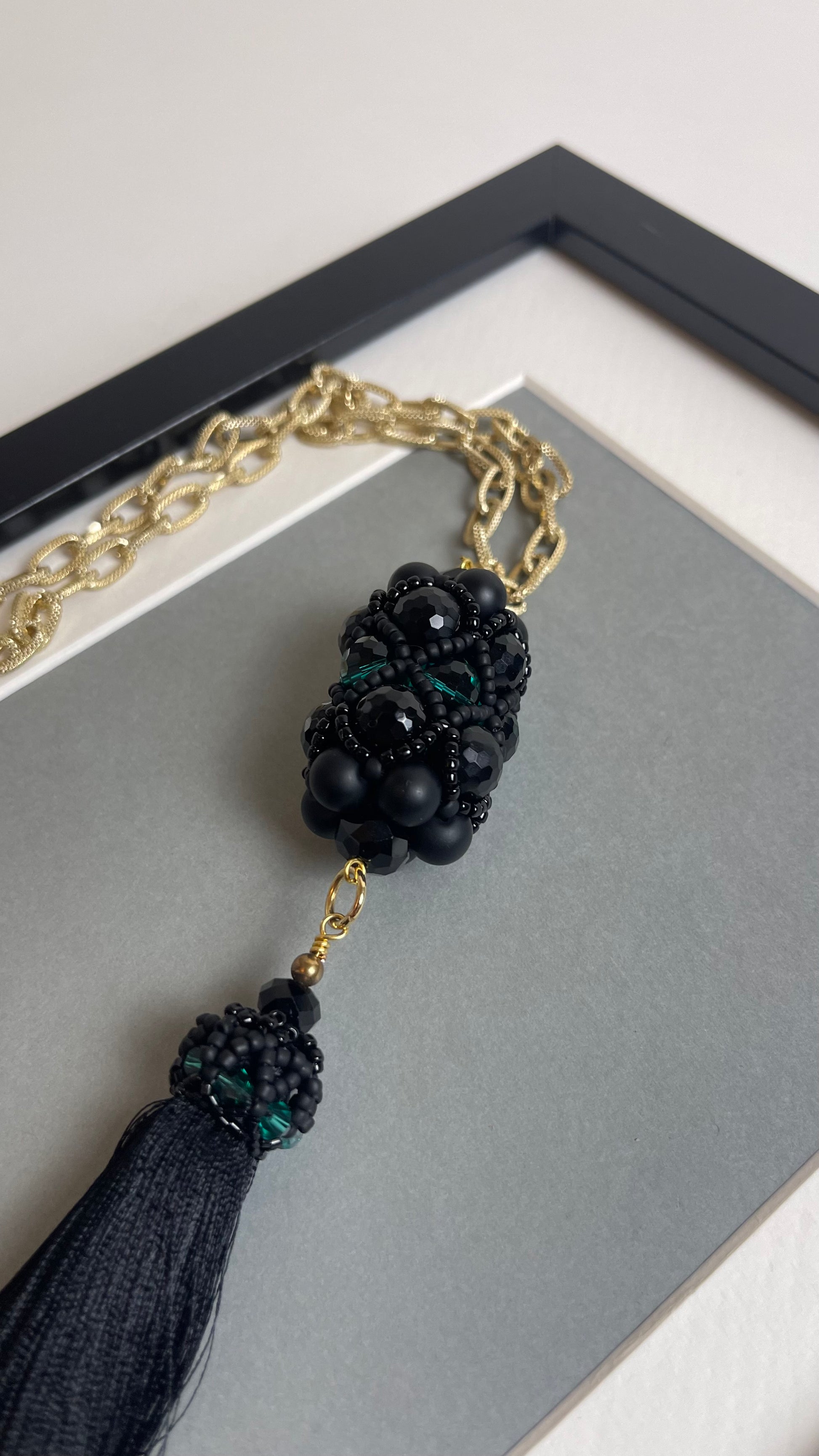 Long necklace with black beaded element (with some green glass beads) and black tassel